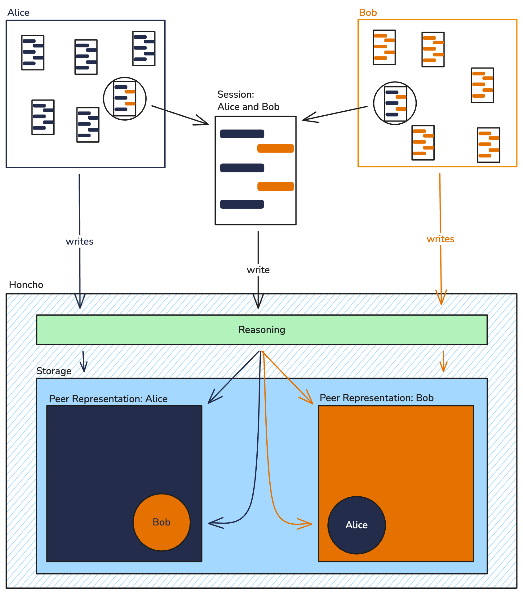 Peers observing others (observe_others): When enabled at the session level, a peer will form representations of other peers in that session based only on messages they’ve observed. If Alice and Bob are in a session together and Alice has observe_others: true, Alice will form a representation of Bob based solely on what Bob said in sessions Alice participated in. Alice’s representation of Bob will be completely different from Charlie’s representation of Bob if they’ve observed different interactions.